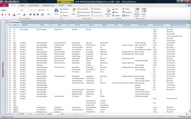 Paper and electronic (Access) databases were first created in 2003 and contained data for the then KCL Zoology and Botany Collections. In the last few years, volunteers have been recording specimens in paper (form-based) or electronic (Excel) formats and we have all been learning ‘on the job’. Inevitably specimens have been catalogued in different ways to record various kinds of information and many specimens remain uncatalogued. Some groups of specimens from a single collector/preparer or from a single source have been catalogued together as eg ‘The Daws Collection’, The Challenger Collection’. The accumulating data were becoming unwieldy as there are now more than 8000 records.