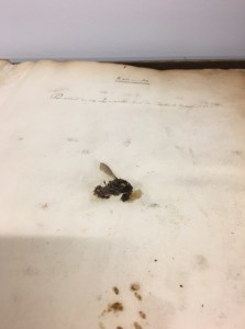 Not only does the age of this collection merit attention, the majority were collected in the late 1700s, but also the method of storage. For these insects, butterflies, beetles, flies etc, were presented as flattened specimens in books. After ‘drowning’ the insects in ‘spirits’ he would press them between the leaves and here they remained for over 300 years. Unsurprisingly not many survived to the present day due to poor preservation but some did.