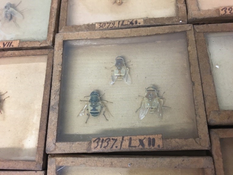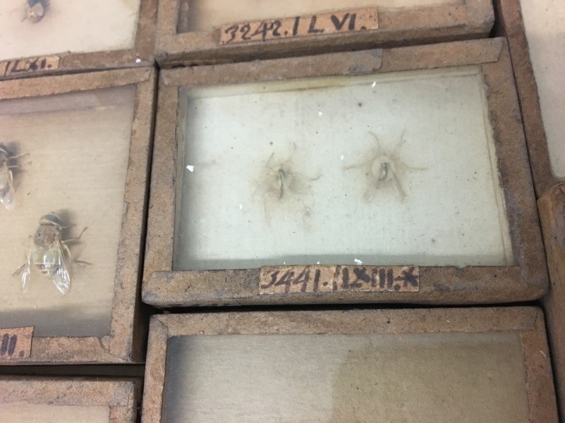 Amongst all of this, there are amazing specimens – some rather famous flies. Shown below are, we think, Eristalis arbustorum – a common hover fly found across Europe. These specimens here are some of the oldest preserved flies on the planet. There is an older collection but the flies are not as well preserved. These little boxes have been inspiring taxonomists for hundreds of years.