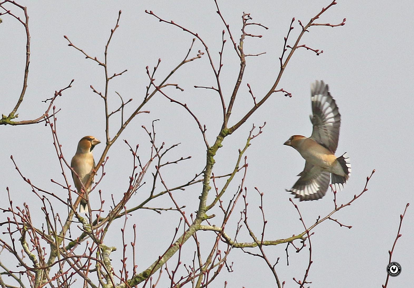 Two hawfinches in a hornbeam tree, taken in Great Hampden, Buckinghamshire. Note the striking patterns on the wings and tail, being kindly displayed by the bird on the right for your appreciation. Image used with kind permission of Nick Truby, © Nick Truby.