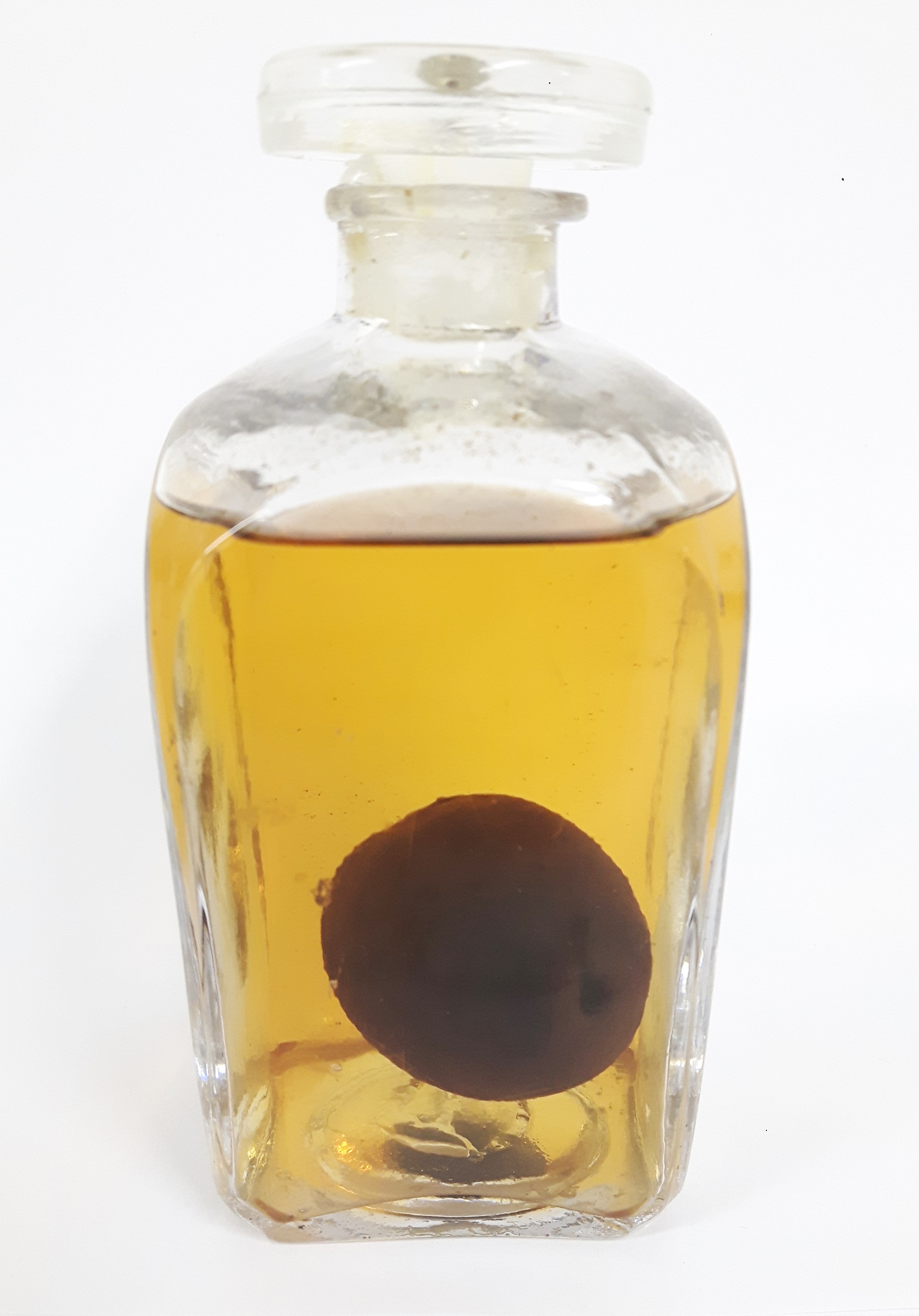 My former colleagues Mark Carnall and Emma-Louise Nicholls first brought this “specimen” to my attention in 2011, when they found it in our wet specimen store: an unmarked bottle of clear brown liquid containing a near-spherical object with a cork stopper in its narrow neck. Mark wrote a blog at the time working through the process of elimination of all the spherical objects that might belong in a zoological collection such as ours. While others had assumed it was a testis, Mark and Emma decided that it was in fact a plum – not zoological at all. Aside from its identity, the other question was: how did a 25mm sphere get in a bottle with a 10mm neck?