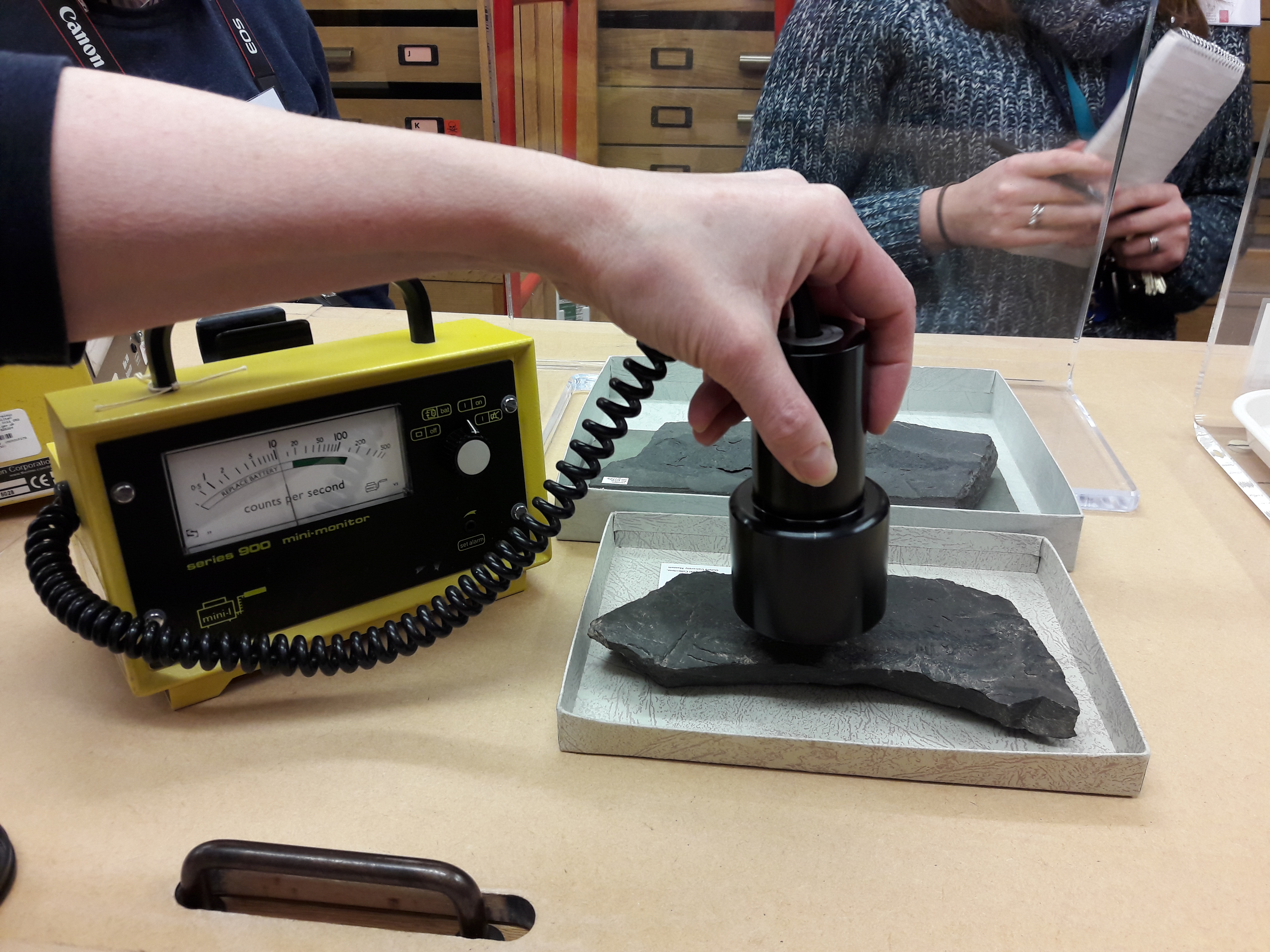 The second practical element to the day comprised some good old radioactive fish. I was fascinated by the Geiger counter’s ability to remain (relatively) silent over the rock but burst into life and buzz like a bee on a honey high when directed over the fossil, having moved only a couple of centimetres. After lots of super-clever nerd jokes about the fish cooking itself and lacking only in its absence of chips, we moved on to sensible advice about storing radioactive material. For example you should spread your material out, as the more radioactive material you have in one place, the higher the dosage you’ll receive when working in that area. You must label everything with specific hazard signs, i.e. ‘Radioactive’, ‘Asbestos’, etc.