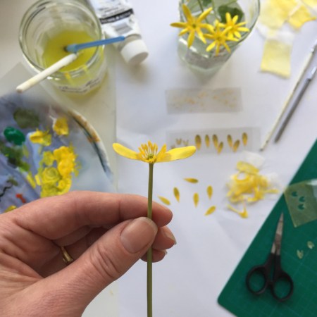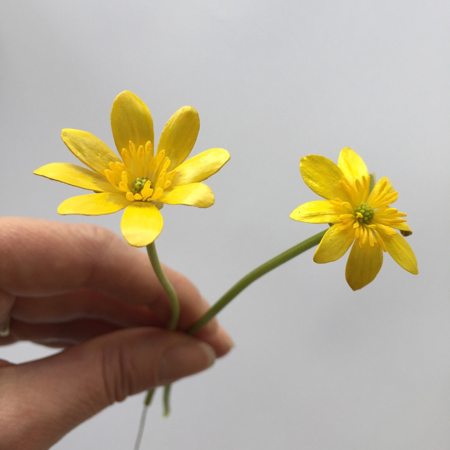 The finished Celandine test piece made from beeswax on the left and the real Celandine flower. specimen on the right. © Annette Townsend
