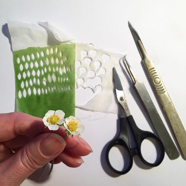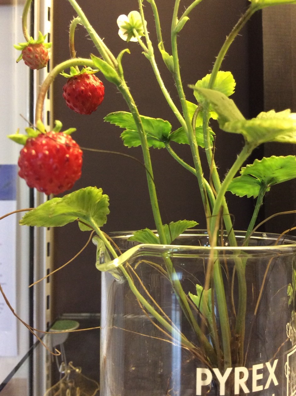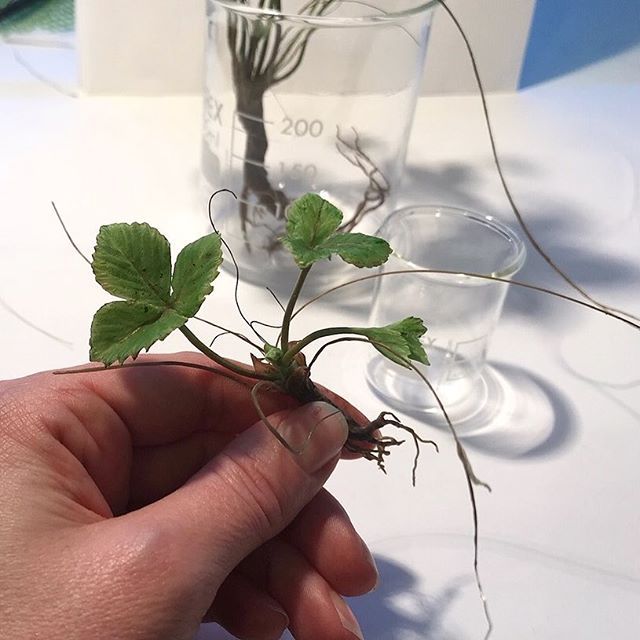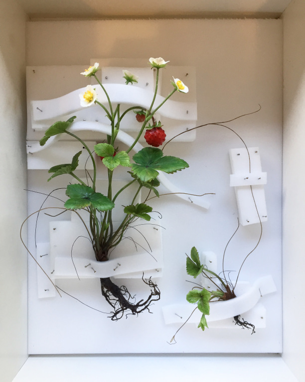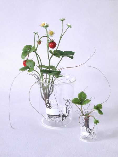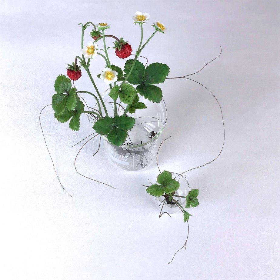 The final sculpture took several weeks to complete. I created moulds from the fresh plant leaves in my garden with silicone and plaster, which I then cast in coloured molten wax. I made stems and plant runners from waxed tinned copper wire, and petals, sepals and stamens from waxed silk fabric and threads. The strawberry fruits were made from wax coated dressmaking beads and I attached tiny plant hairs made from silk to the stems and leaves. The sculpture was finished with acrylic paints and varnishes and displayed in Pyrex glass measuring beakers in reference to the scientific nature of the work.