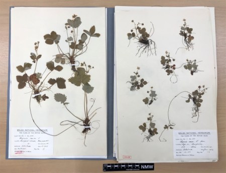 Fragaria vesca, Wild strawberry – pressed, dried and mounted herbarium specimens from National Herbarium of Wales at Amgueddfa Cymru – National Museum Cardiff. © Annette Townsend