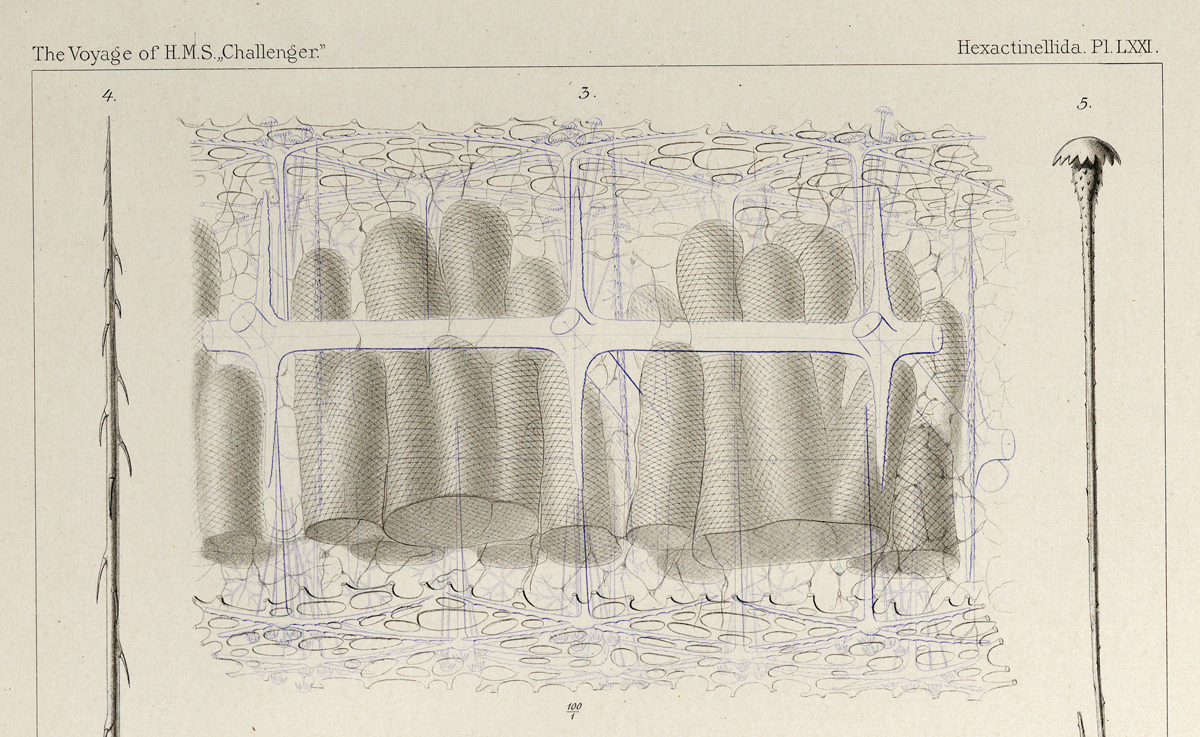 Detail of the wall of the sponge Eurete semperii [sic] taken from Plate LXXI of “Report on the Hexactinellida collected by H.M.S. Challenger during the years 1873-76”. By Dr. F.E. Schulze