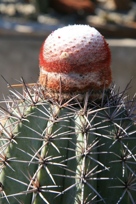 The plant has a phylloclade (modified stem that functions as a leaf, aids in photosynthesis and helps to reduce the rate of transpiration) and is easily recognizable by a woolly, bristle-coated structure at the apex of the plant, containing a mass of areoles from which the small flowers grow. At first glance, the dried flower looks like a furry cat, some people even think of it as a pineapple due to its spines and hexagonal structures on the flower. The fruits of this plant are edible. The juice of the plant is used to quench thirst and the plant is also used for medicinal purposes across many parts of the World.
