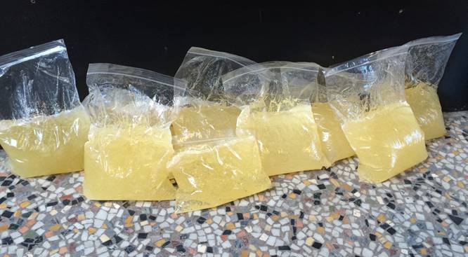 Figure 4. Bags of gel ready for use on the tree. The team are so grateful to all their colleagues who mixed up huge quantities of gel in their spare moments.