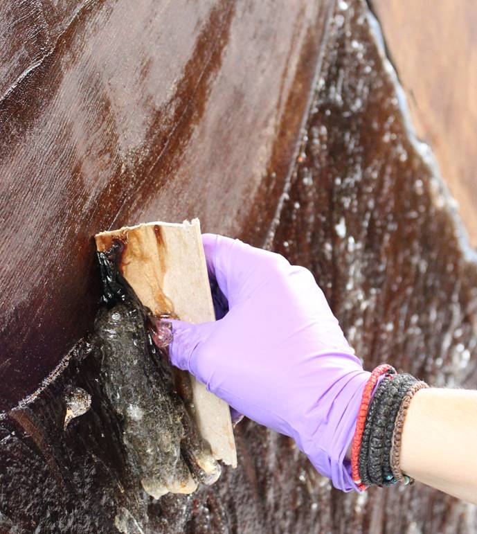 Wood is a complex mix of components with diverse solubility parameters. The safest solvents for treating both the wood and the bark are mineral spirits. Therefore 8% Laropal® A81 (in white spirit and isopropanol) was chosen for consolidation of the bark, and 20% Laropal® A81 as a protective varnish for the wood.