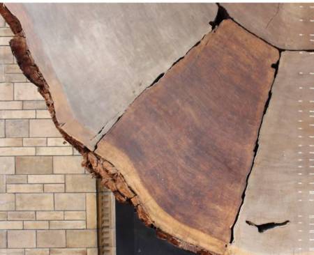 By 2016, a substantial amount of dust had accumulated on the horizontal surfaces of the specimen, the bark suffering the most due to its fibrous nature. The wood surface had previously been treated with a lacquer that had become discoloured, bloomed and cracked, obscuring the growth rings.