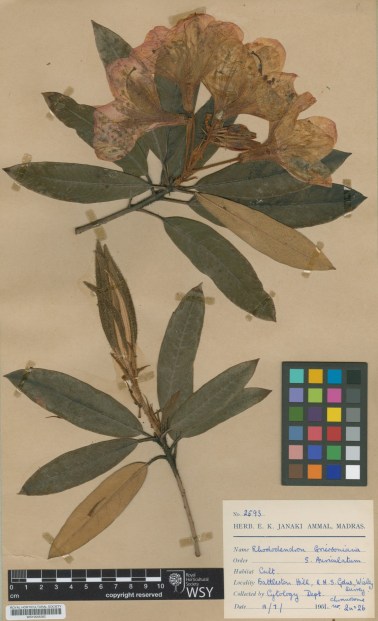 Herbarium specimen made by E.K. Janaki Ammal of a cross between Rhododendron griersonianum and R. auriculatum © The Royal Horticultural Society