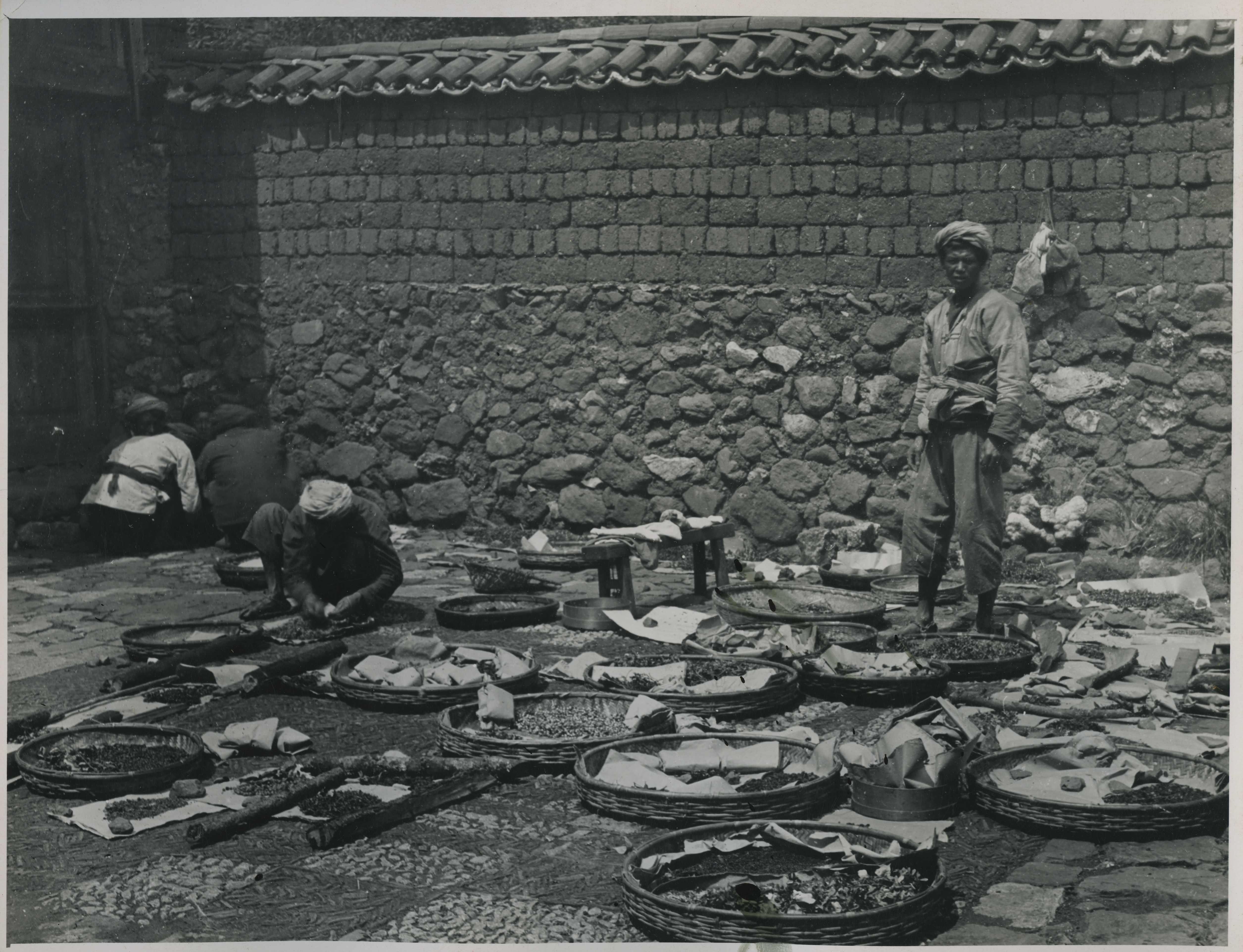 Forrest’s collecting team with stacks of drying papers roped to wooden saddles ready for mule transport. Lao Chao is seen here, fifth from the right © The Royal Horticultural Society and Royal Botanic Garden Edinburgh