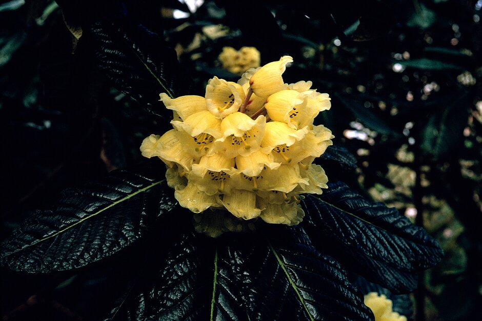 As mentioned above, many specimens were collected during periods of Forrest’s absence and here is a case in point. During a visit to Bhamo, Forrest sent his collectors back to Tengyueh ahead of him. The collecting teams returned from the Shweli-Salween Divide with a mule-load of seed, including a specimen of a 6-9 m Rhododendron with huge leaves up to 76 cm in length. Named Rhododendron sinogrande, it caused a sensation back in the UK and Forrest was celebrated for ‘his’ find (McLean 2004: 112).