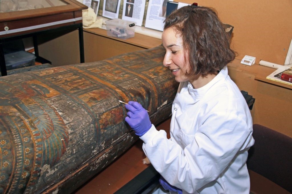 The ‘Tahemaa Transformed’ project was initiated in 2019 to raise the funding needed to conserve Tahemaa’s coffin and purchase a new, custom-made display case. I am currently undertaking the conservation treatment of the coffin, which is a long process and will take many more months. While we want Tahemaa restored to her formal glory, her age and historical significance means that any conservation treatment undertaken needs to be sympathetic and minimal. The priorities of treatment for the coffin are therefore to clean the surface to remove the accumulation of dirt and to consolidate the paint and plaster layers to prevent any further surface losses.