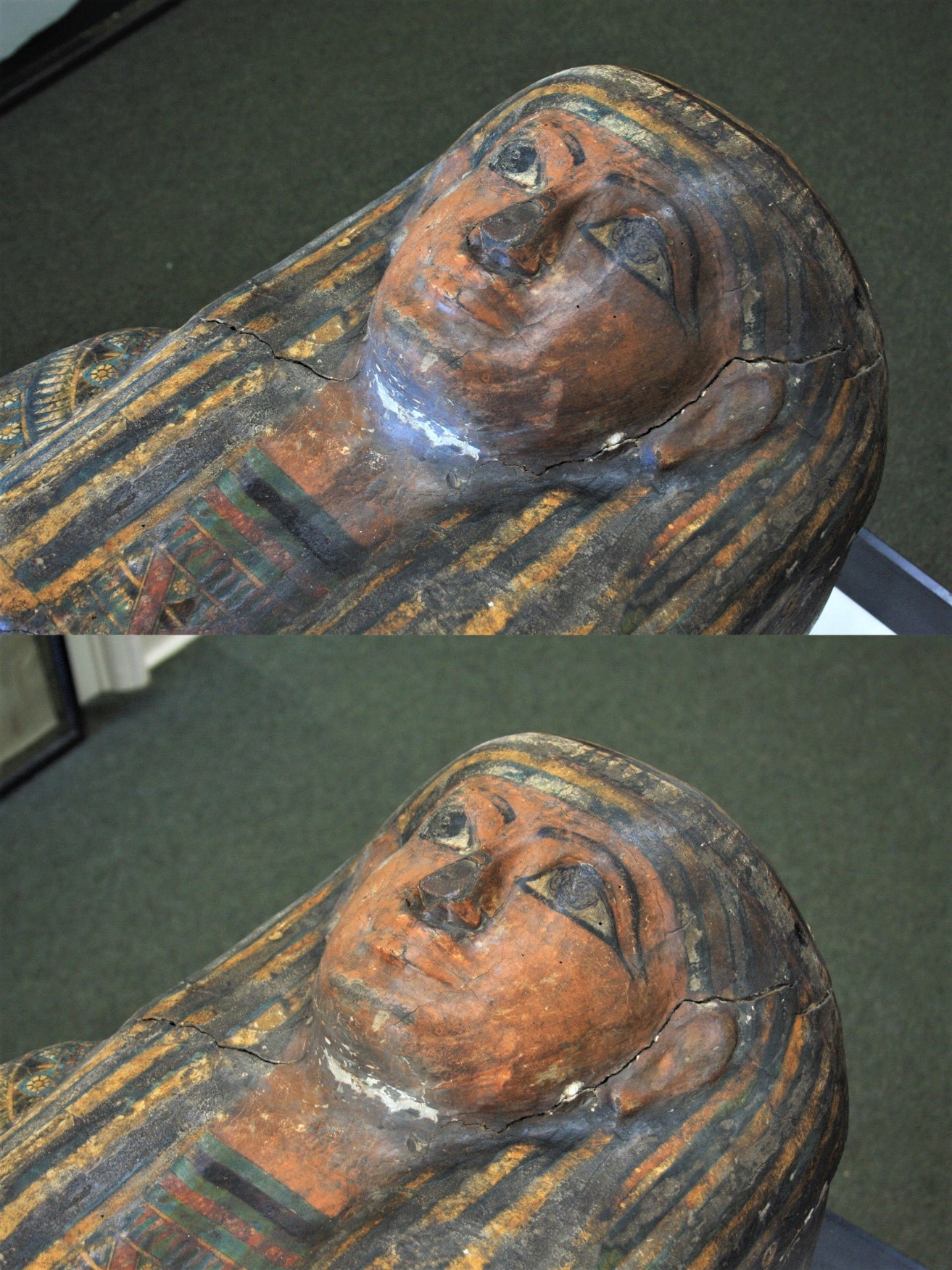 Tahemaa has been at the Society for nearly 100 years but she has spent most of this time locked away from public view. In 1993, the Society decided to put her on permanent display in the Egyptology exhibition. Since then she has been seen by thousands of admirers, however due to her age and fragile condition, she is in need of urgent conservation treatment. Hundreds of years in an unstable environment have caused significant damage to the coffin. The fluctuations have caused the wood, plaster layers and paint to crack and flake. The layers of the coffin have even separated in some areas, lifting away from the wooden frame (fig 2). Many years without a display case has also resulted in a thick layer of dark, engrained dirt concealing the original colours of her decorative paintwork (fig 3).