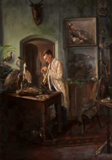 The painting depicts Fred at work surrounded by taxidermy specimens. He became an excellent taxidermist and prepared many hundreds of specimens. More detective work in the museum archive shows the Spoonbill on the desk (the tall bird closest to Fred) was prepared in 1924; the Heron (the other tall bird on the desk) was prepared in 1923 and the Glossy Ibis (on the window ledge) was prepared in 1920. So this fascinating painting depicts a real person, place and objects. It also shows beautifully how our historic collections complement each other. The original 1883 building expected to reopen to visitors as OMA in 2021.