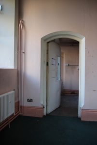 This is the building opened in 1883 which many, many years later was connected to Gallery Oldham by the bridge link from the second floor. A wander through this splendid old building reveals handsome arched doorways are used throughout. Using the painting I eventually traced the actual doorway and window, which is not in the painting, but light from it bathes Fred’s microscope and specimens.