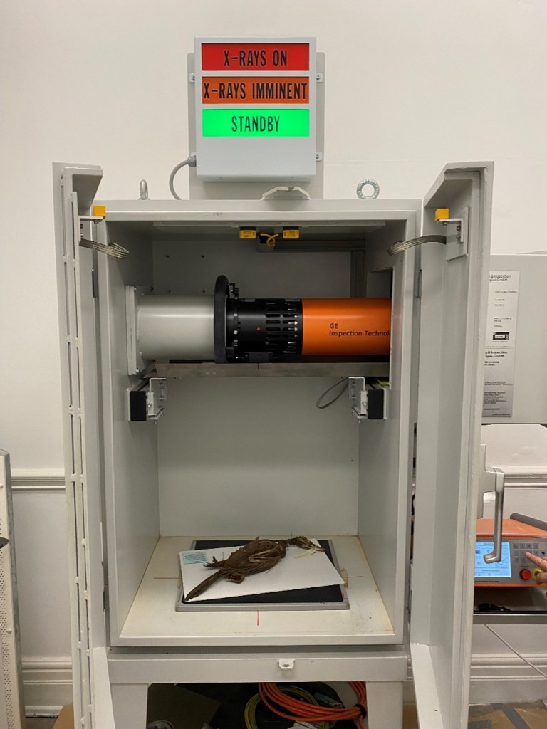 The initial stage of the project saw the specimen taken to the labs of Birmingham Museum and Art Gallery, where Drakon Heritage and Conservation were renting lab space. This was to allow an initial x-ray to take place, in order to get a better idea of the condition of the specimen, and investigate the source of a rattle that came from inside the specimen when moved. It was also aimed at providing some interesting images for future public engagement work.