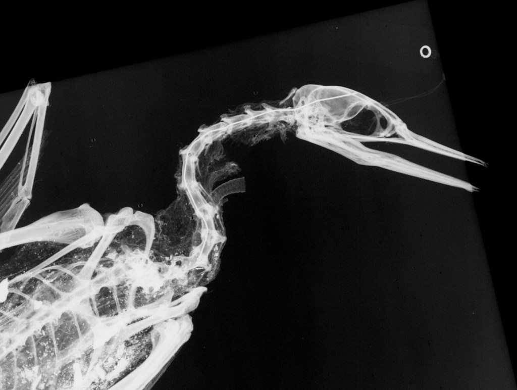 The x-ray showed that the interior of the specimen was in generally good condition, and identified the rattle as coming from a mix of loose materials inside the body of the cormorant (soils, iron corrosion products and old dried bits of biological tissue). It also showed a thin wire that had been threaded from the skull along the neck for support at some point – this work is not visible from the outside of the specimen, and had not previously been recorded.