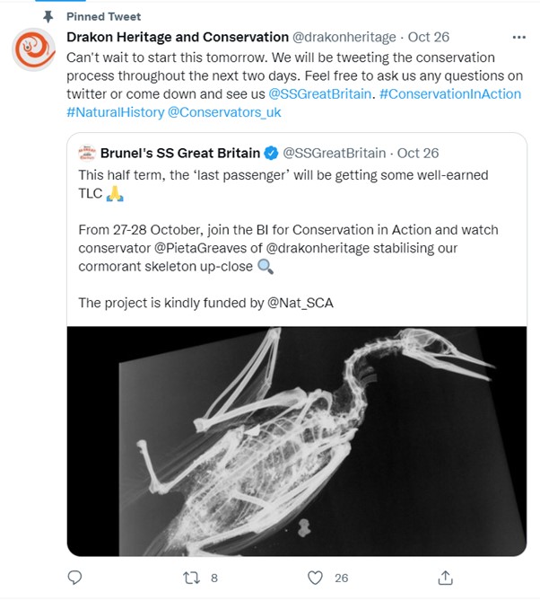 While carrying out the work Pieta live tweeted from the Drakon Heritage Twitter account (@drakonheritage). The SS Great Britain Trust also featured the work on Twitter, Facebook and Instagram (all @SSGreatBritain).