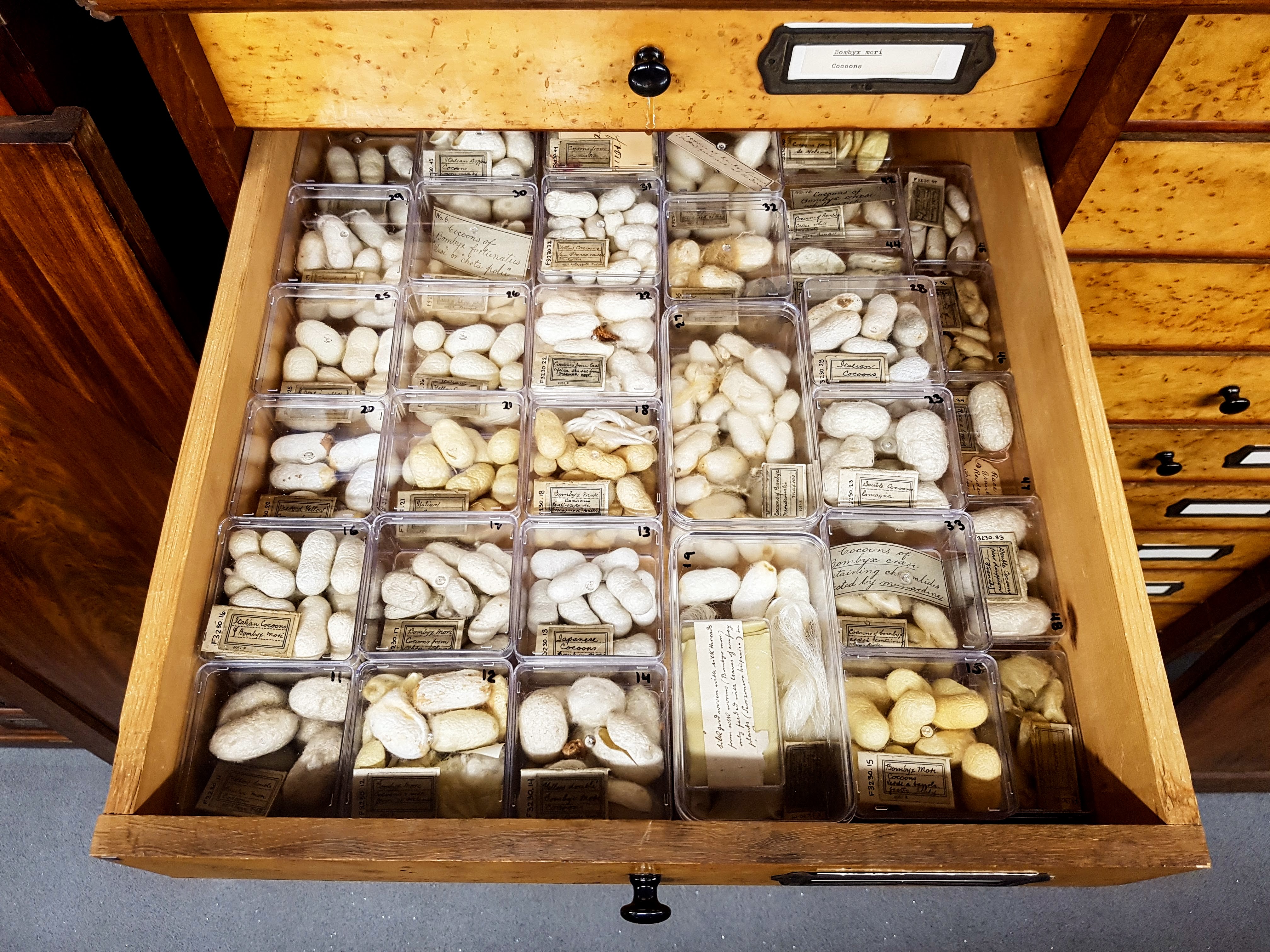 My ‘personal treasure’ occupies an antique wooden cabinet with 26 drawers and is known as ‘F3230. Silk and cocoon collection’. With a definite weak spot for Lepidoptera and a long-standing interest in the intersection between nature and culture, I was particularly happy to work on this task.