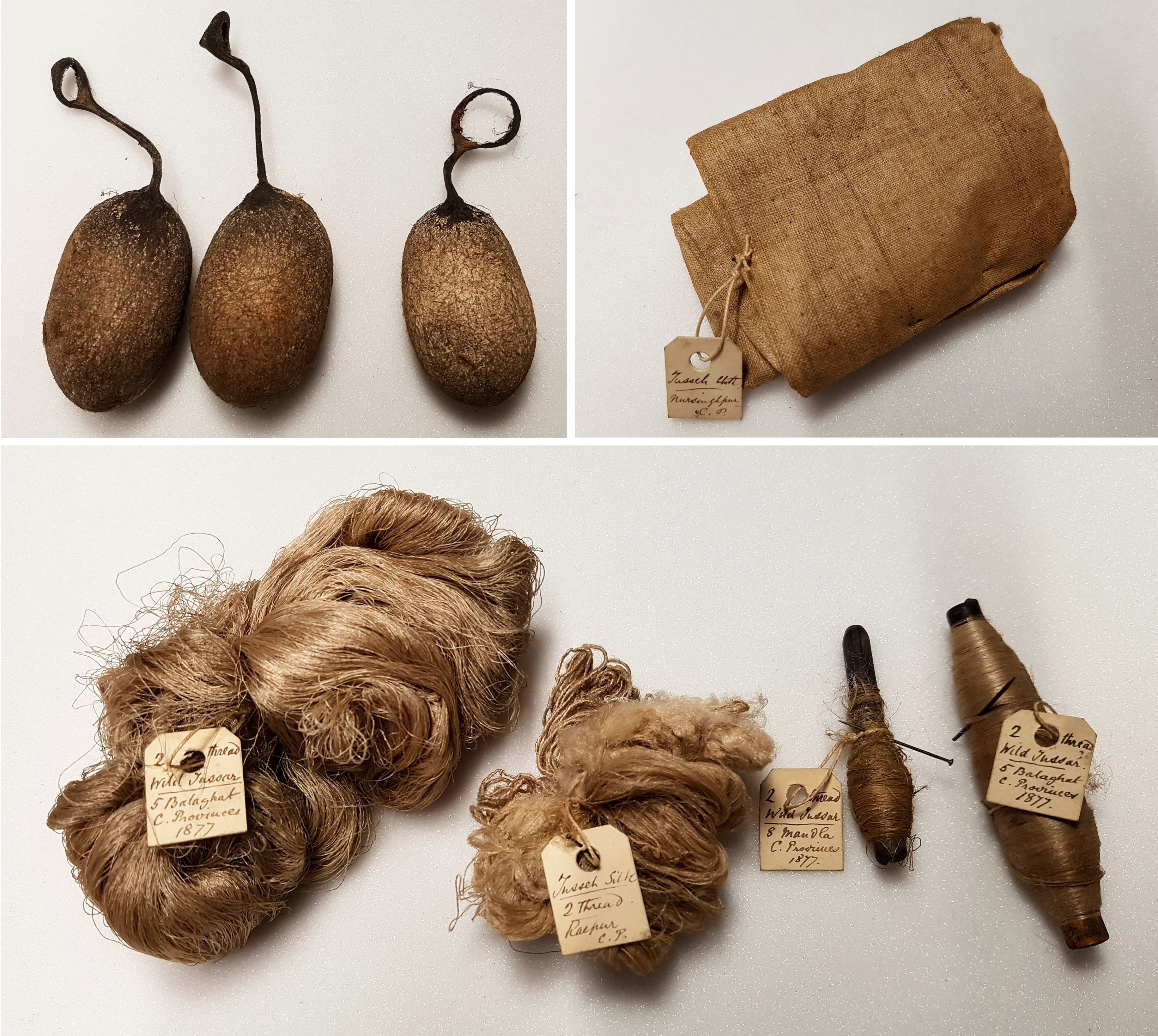 In terms of economical importance, there are four or five main types of silk, each produced by one or more silk moth species, all of which are well represented in the collection by cocoons and various forms of raw silk: mulberry (Bombyx mori), tropical tasar (Antheraea paphia, syn. A. mylitta), temperate tasar (A. pernyi, A. roylei, A. yamamai and A. polyphemus), muga (A. assamensis) and eri (Samia cynthia and S. ricini). It might be worth mentioning here that the Museum also has an extensive collection of adult silk moths, which is housed separately from the silk and cocoon collection.