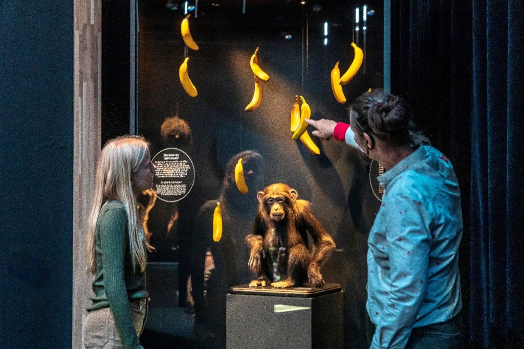 My personal favourite vitrine is filled with a mounted chimpanzee and bananas. This vitrine reminds viewers that chimps are not our ancestors, but our cousins. We share 99% of our DNA with them, however, we also share 50% of the same DNA with a banana. We are related to a banana! This insight, that we are all connected, guides visitors to the idea that we need to take care of each other and everything in the natural world, because not treating the natural world well is equivalent to not taking care of ourselves.