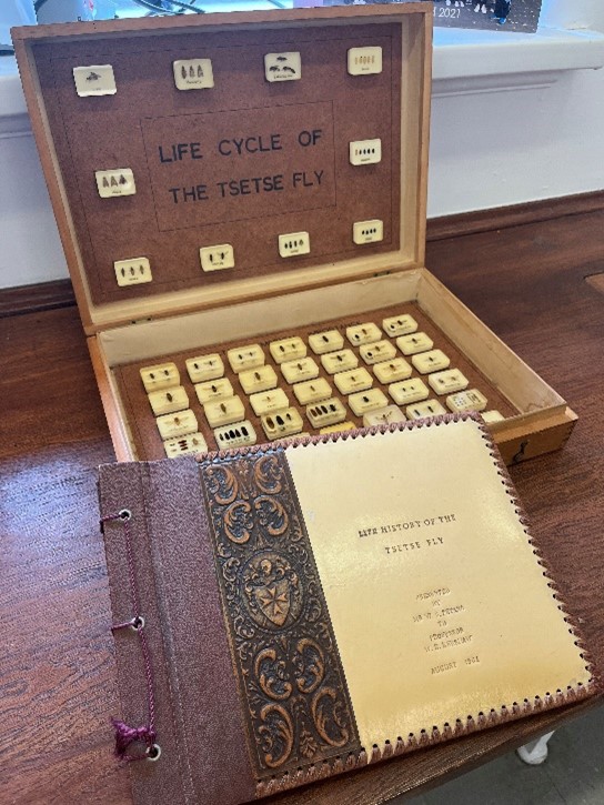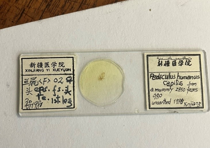 Many of the samples discovered were simple pinned insect specimens in storage boxes, however during our search we found some absolute gems. One such item is a presentation box and matching book on the “Life History of the Tsetse Fly”, presented to Professor W. E. Kershaw by a Mr W. B. Patana in 1964. The book contains many beautiful pictures of the tsetse fly lifecycle, whilst the box has the most wonderful display of specimens encased in resin (see picture above). This find has been incredibly useful to use both in a teaching capacity and to use in public engagement activities. Crowds are drawn in by it’s ‘old school’ feel and historic sentiment whilst also excellently demonstrating the tsetse lifecycle. Another notable find was a microscope slide dated 1980, showing a preserved head louse (Pediculus humanus capitis) from a 2850-year-old mummy in the Xinjiang region of China! It also appears that our previous colleagues had a knack for art – creating the most beautiful drawings of many entomological specimens, several of which are now used in display cases and in teaching sessions.
