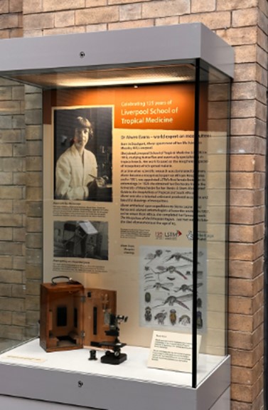 A handful of the laboratory’s mosquito specimens are currently being used in a National Lottery Heritage Fund funded project, entitled “LSTM- Past, Present and Future”. This project was designed by Sci-art practitioners Tom Hyatt and Natasha Niethamer who created the “Tropical Medicine Time Machine”, transporting users through LSTM’s past, present and future research, including themes of vector biology, public health, snakebite and travel health. This piece of work has been on display to the public at the World Museum, Liverpool over several weekends with amazing success engaging people of all ages. Another Dagnall Laboratory item used in public displays is one of our historical microscopes. It forms part of a display in the auditorium of the World Museum introducing Dr Alwen Evans, LSTM’s first female lecturer. She began her work at the school in 1918, researching Anopheline mosquitos (malaria vectors), going on to become a world-renowned expert in the field. During the investigation of our treasures, we were lucky enough to find preserved microscope slides of mosquitos made by Dr Evans herself – one of which can be found amongst this display.