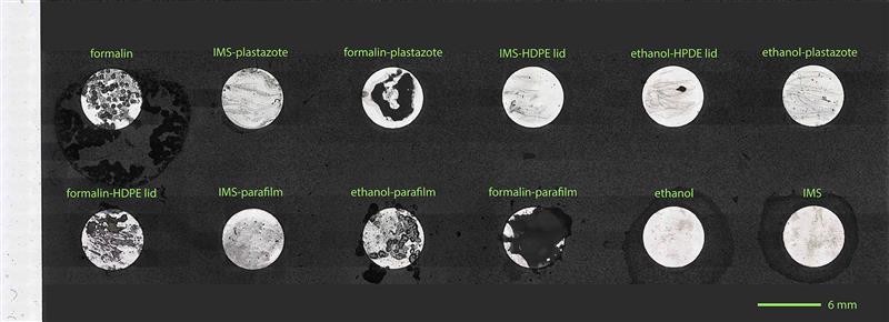 Please note that there are many types of preservation fluids used to store specimens and only three were trialled here. Other recipes could have adverse effects on HDPE lids.