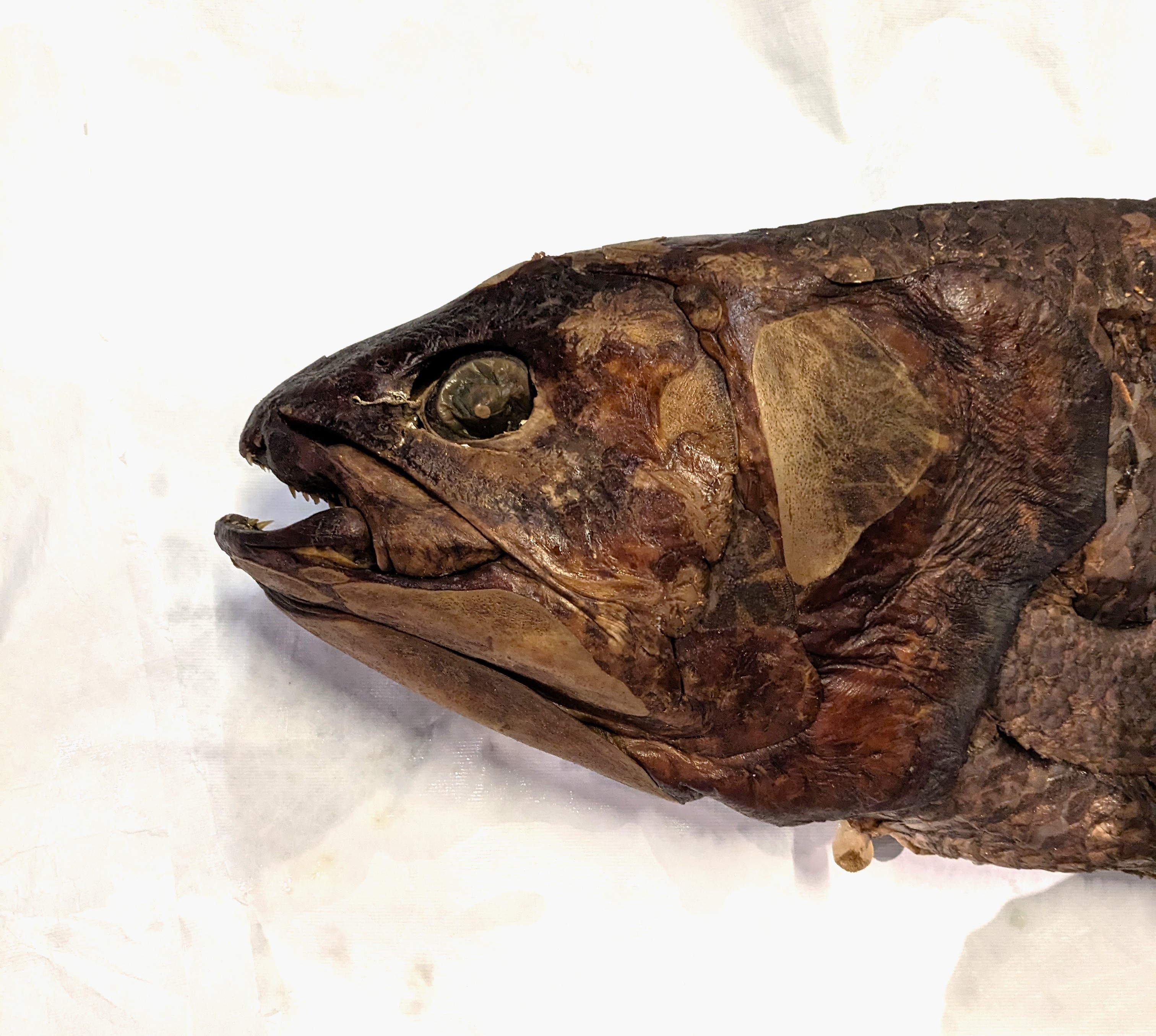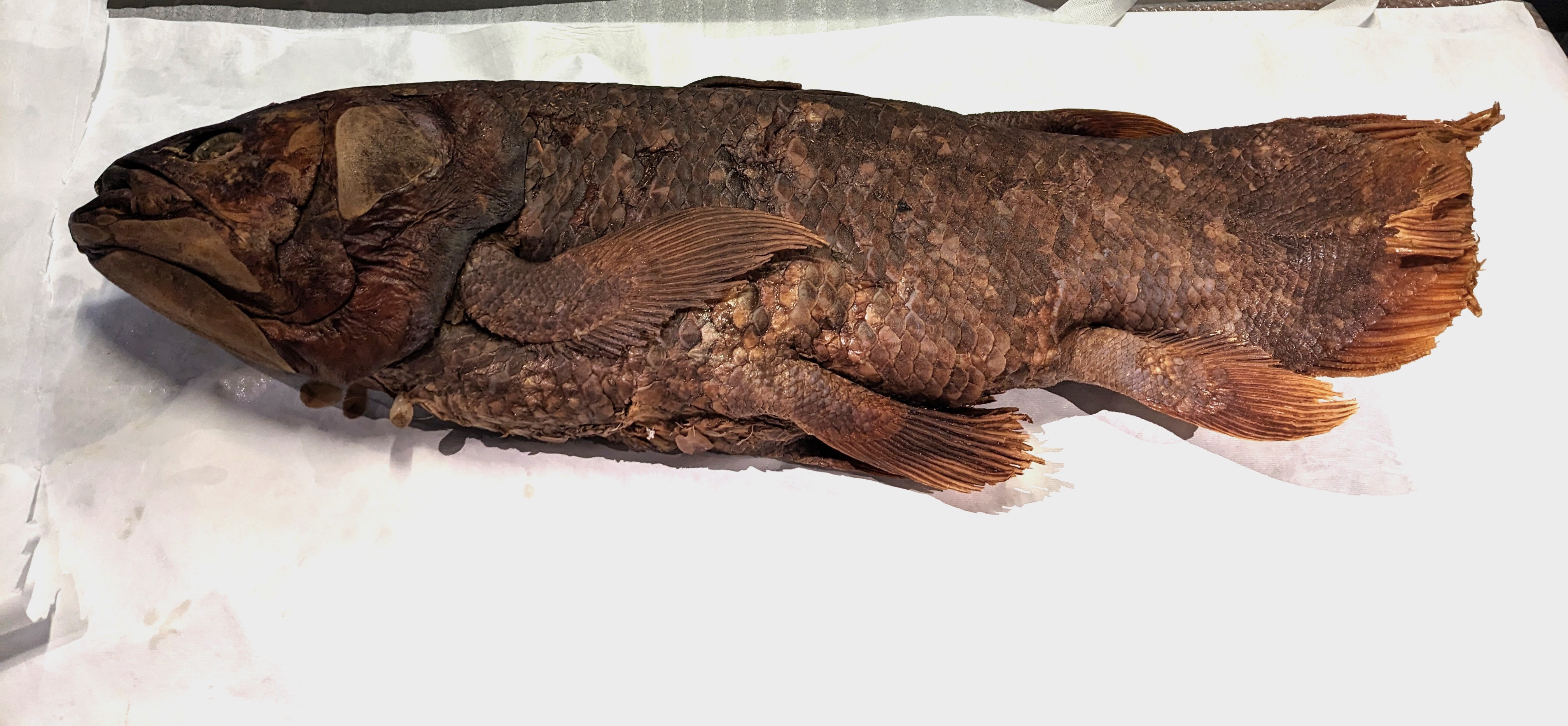 Our specimen is an African Coelacanth, Latimeria chalumnae. The species is one of just two surviving members (the other being the more recently discovered Indonesian Coelacanth) of a clade of Sarcopterygian fishes called the Actinistia. The group appears in the fossil record about 400 million years ago and the most recent fossil Coelacanths date to about 66 million years ago. The Actinisitia were thought to have vanished into extinction until Majorie Courteney-Latimer’s famous find in South Africa in 1938 (1).