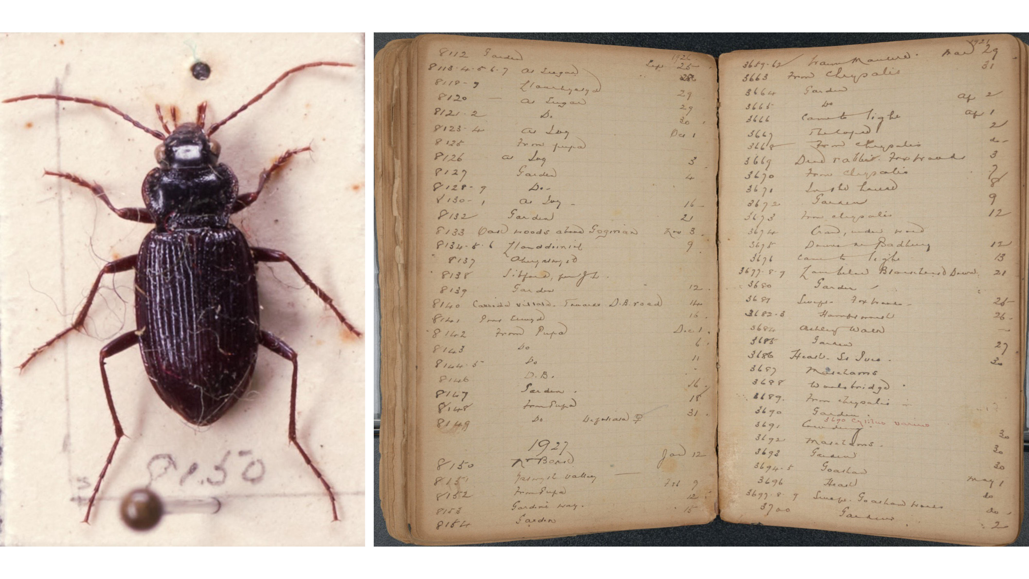 My work at Amgueddfa Cymru – Museum Wales focused on a drawer of Carabidae (ground beetles) collected by Salter in Ceredigion between 1923 and 1942, which contained around 300 card mounted specimens without locality or species identification labels. Each card contained only the specimen and a small, handwritten number pertaining to the relevant entry in one of Salter’s field logs, which held the information about the location and date of specimen collection. The goal for my time at the museum was to make the specimens in the drawer more useful to those accessing the collection in the future, by giving them detailed labels, and uploading their information to the relevant collection databases.