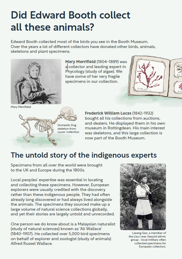 The new ‘Peopling the Booth’ display of 10 panels and objects used the questions as the lead. We used 5 of these panels to explain what taxidermy is from the Victorian period to the modern day. The rest explain how things were collected and how the museum runs.