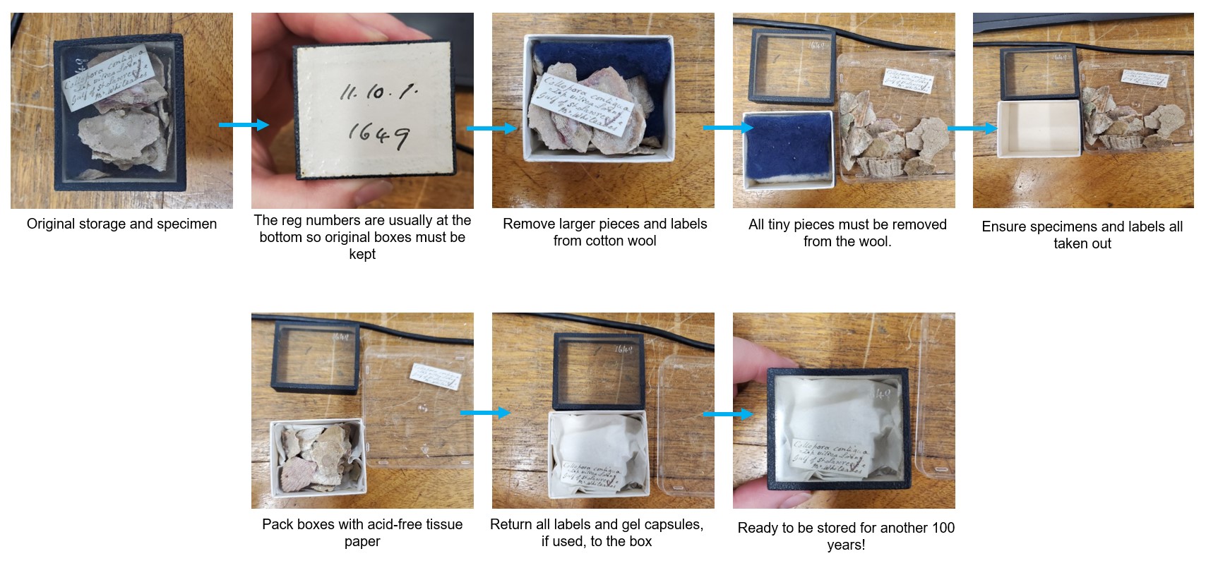 Below is an example of the common ‘blue cotton wool’ issue. The wool is predominantly within the 1911/1912 Alfred Merle Norman collections. The Norman collection is a huge acquisition spread across various groups of invertebrates, with a large amount in Bryozoa. The biggest challenge here is picking tiny specimen fragments out of the cotton wool. Due to the colonial nature of bryozoans, every piece is essential to keep so this process is incredibly time consuming and sometimes is just not possible due to the nature of the specimen. The Norman boxes are also significant as the registration number is often written on the bottom, meaning this box can be used to reunite specimen data from the registers if the specimen ever became disassociated. Therefore, the decision has been made to keep the boxes but line the insides and wrap the specimens in acid-free tissue paper which has been Oddy tested.