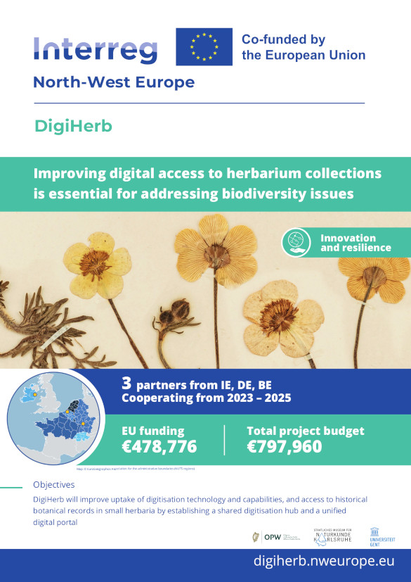 The DigiHerb project builds on the successful concept of herbarium consortia; an alliance of multiple small herbaria with a shared goal of digitizing collections. By pooling resources, sharing expertise, and consolidating digital collections under a unified data management system, we aim to enhance access to these valuable specimens. The project capitalises on high-throughput digitization technology, such as a high-speed conveyor-belt imaging system, capable of digitising up to 400 sheets per hour. Previously used only in larger, well-funded herbaria, this equipment will now be shared among the three project partners, making digitization more affordable and efficient. The digitisation hub will start in Ireland and later move to Karlsruhe, Germany.