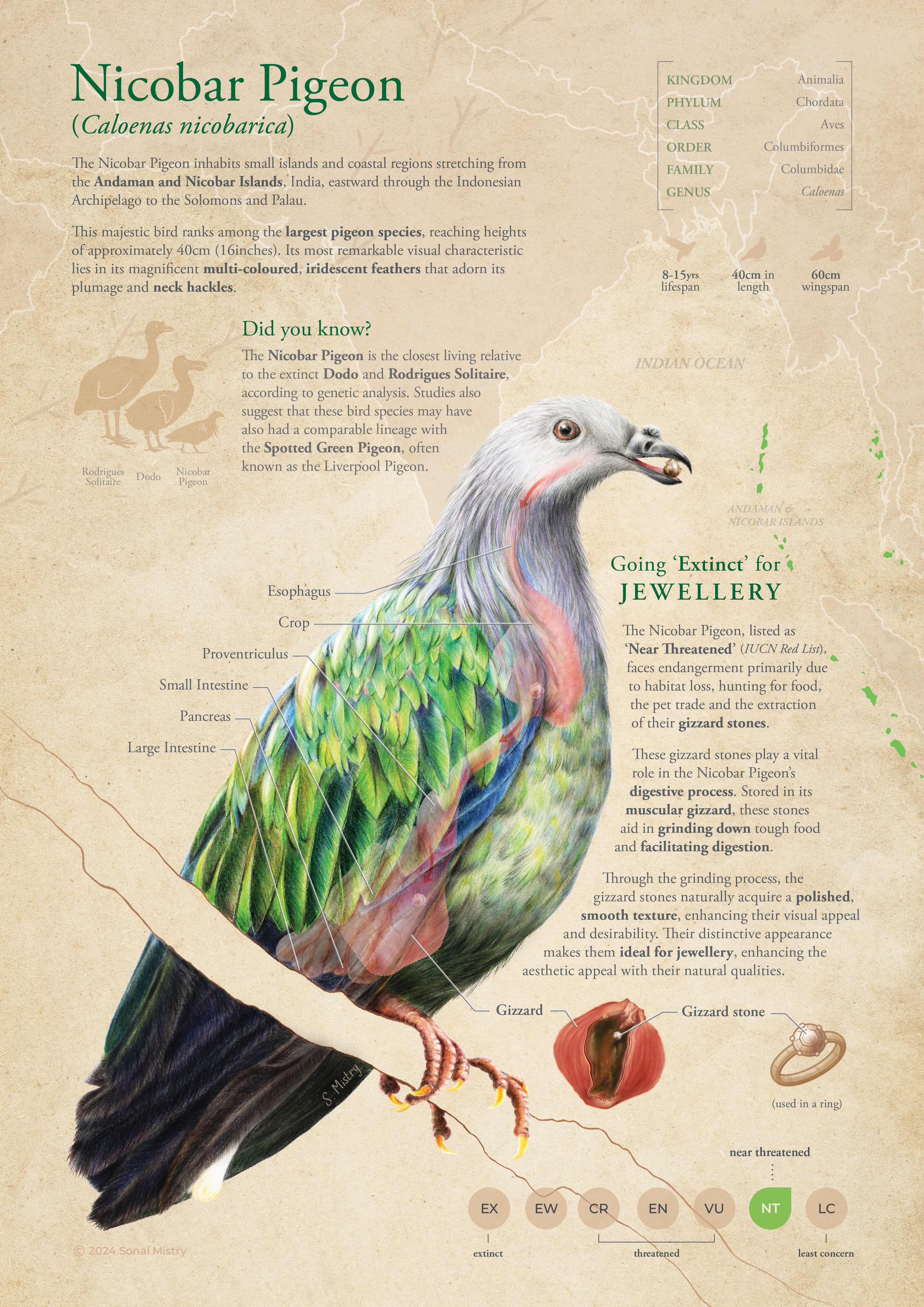 3. Going ‘Extinct’ for Jewellery. Written by Sonal Mistry (Masters Students in Scientific Illustration, Zuyd University of Applied Sciences, the Netherlands) and Olivia Beavers (Assistant Curator of Vertebrate Zoology at World Museum, National Museums Liverpool). An interesting insight into Sonal’s explanation of her university assignment shedding light on the endangered status of Nicobar Pigeons and the unconventional use of their gizzard stones in jewellery.