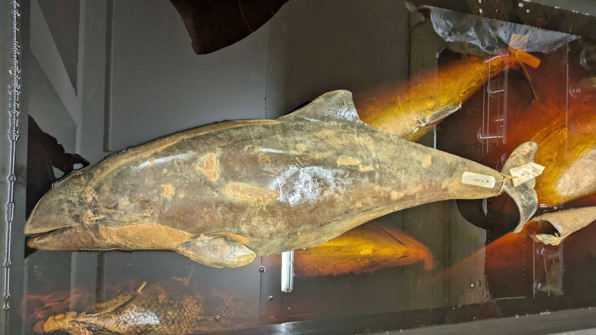 (left) Halfway point in the “big tank” room. (right) One of, if not the, largest fluid specimen in the collection. NMINH:1966.6.1 is a whole harbor porpoise Phocoena phocoena (Linnaeus, 1758). It is worth knowing it is one of the few specimens that remained its recorded length – over 1.2m long.