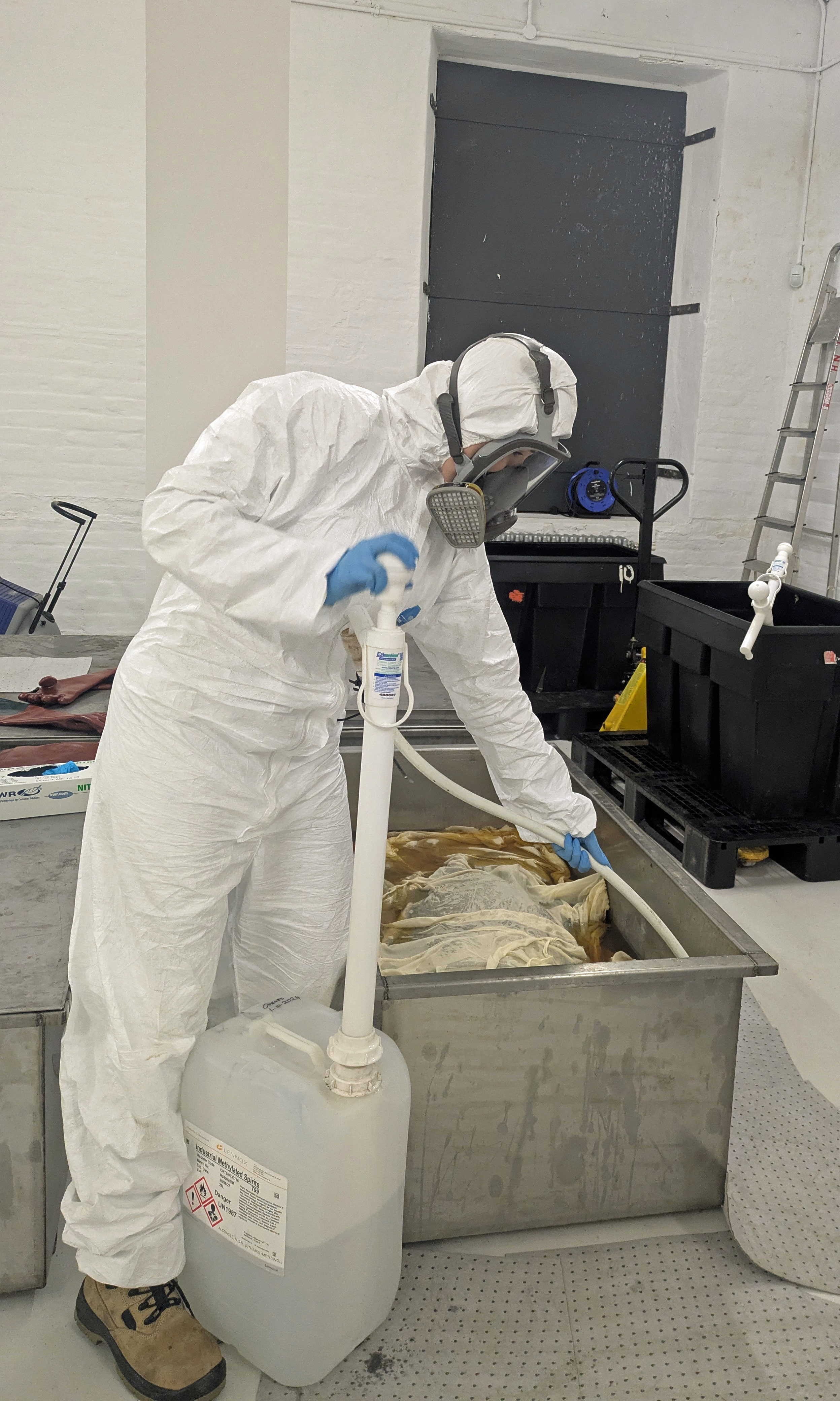 Staff wore 3M 6000 full-face masks with A1 Form filters, white coats or Tyvek suits, close toed boots, nitrile and/or PVC Gauntlets gloves. (left) (L-R) Anna Massignan and Fionnuala Wright cover fluid species in alcohol-soaked muslin. (right) Vertebrate curator Emma Murphy refills a steel tank in its permanent position with the 70% alcohol solution. Note that the tube is directed to the wall of the tank away from the specimens still covered in muslin.