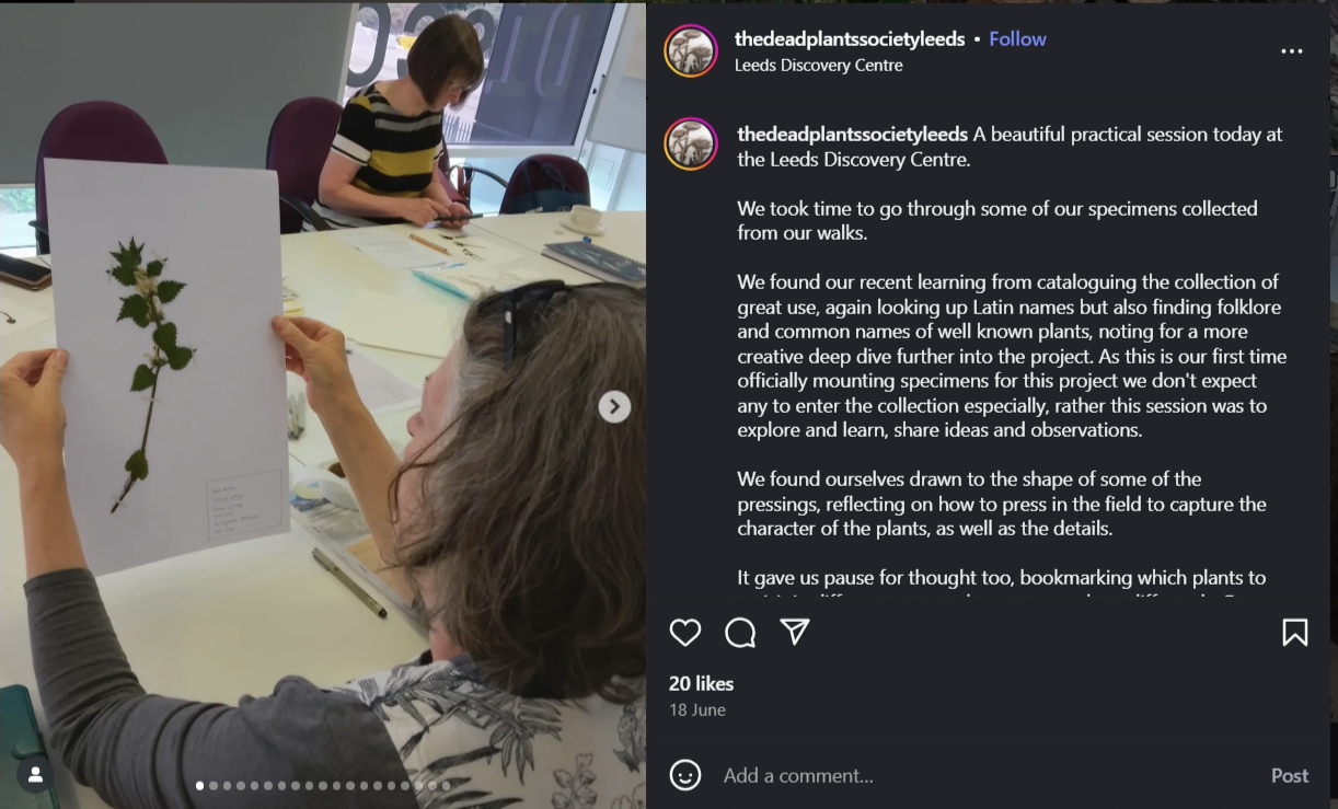 Another case study, and one close to my heart, is the current ‘Dead Plants Society’ project at Leeds. We’ve partnered with an arts and social change charity in East Leeds called ‘Space2’. With funding from the Esmée Fairbairn Collections Fund, Space2 participants are going to mine Leeds’s botany collection for stories, historical connections, herbal and folklore, environmental change records and artistic inspiration.