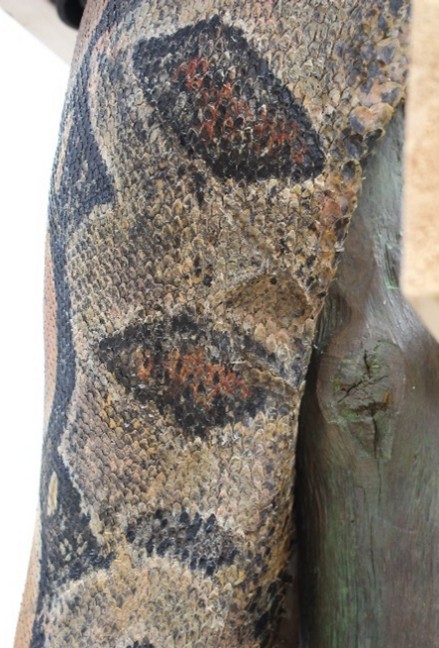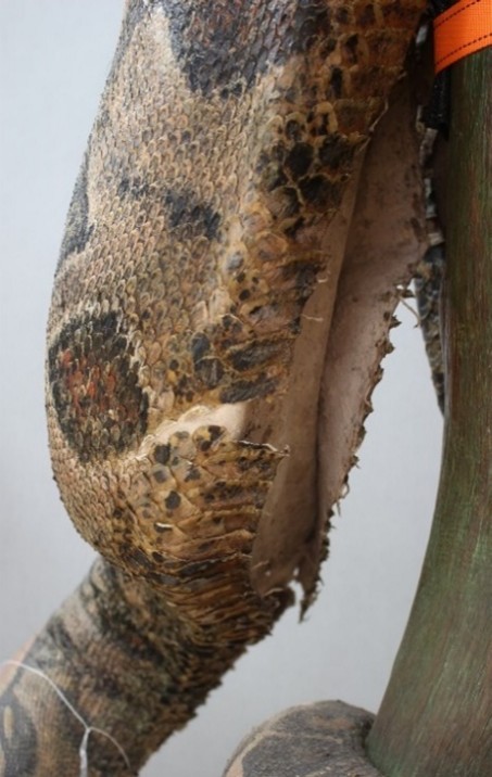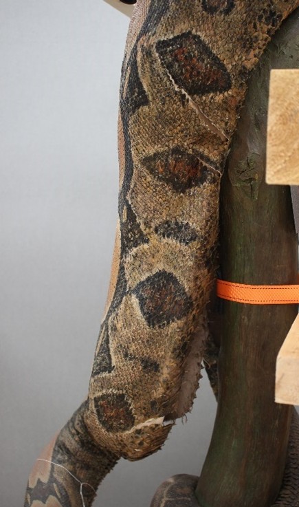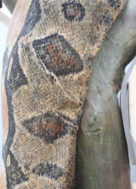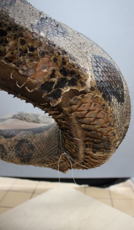 The snakeskin edges were also reinforced with the thicker Japanese tissue to help minimise any future movement and some areas were bridged with the Japanese tissue. Splits were gap filled with a layer of Lascaux™ 498HV and paper pulp mixed with acrylic paint to form a base. Pieces of Japanese tissue were then colour matched using acrylic paint and cut to form separate scales. These replicated scales were then adhered to the surface of the fills using Lascaux™ 498HV adhesive and then carefully colour matched tonally again to the surrounding area, allowing splits to be blended into the snakeskin and to disguise any visible areas of damage.
