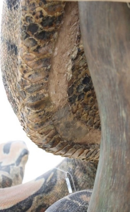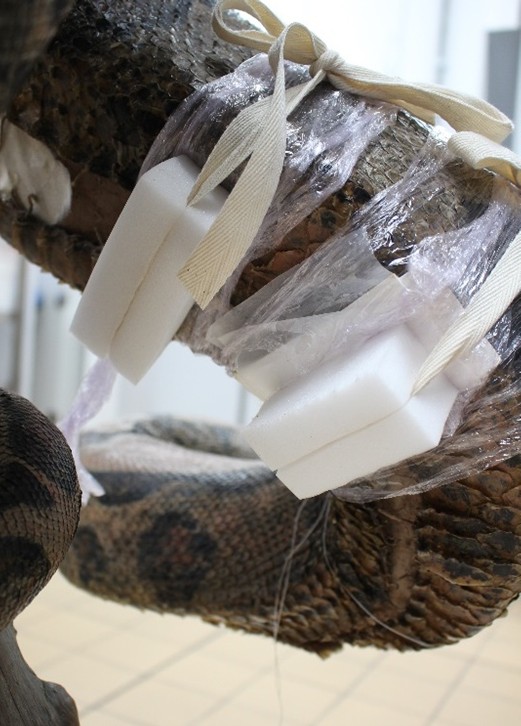 A novel approach was devised using clingfilm, cotton tape and pads of Plastazote™ (closed-cell, crosslinked polyethylene (XLPE) foam). The Plastazote™ pad was held in place with a slot cut into the foam structure and cotton tape was fed into the slot with enough tape to wrap around the snake. Clingfilm was wrapped over the humidifying sandwich to contain the moisture and wrapped onto itself around the circumference of the snake. The Plastazote™ pad was then positioned over the sandwich and the tape wrapped around the circumference of the snake, over the clingfilm and could then be tied securely into position. Additional pressure/stabilisation was added where necessary by packing out with extra pieces of Plastazote™ gently pressed into the void between the snakeskin and the tree trunk.