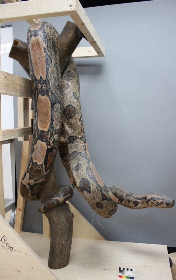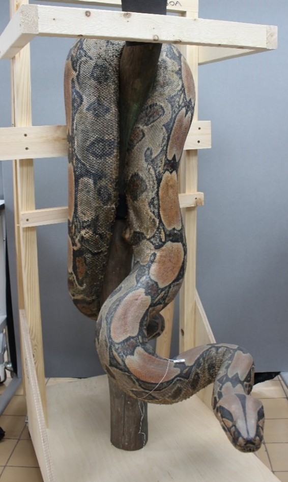 Boa Constrictor on a bespoke minimal wheeled frame prior to remedial treatment ©The Trustees of the Natural History Museum