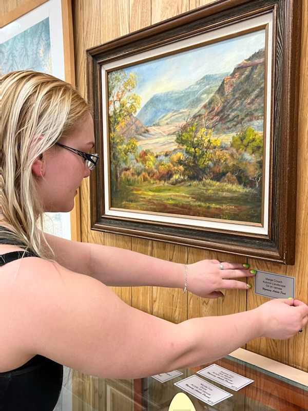 Casper College Museum Studies student putting the finishing touches on the art show installation. Credit- Patti Wood Finkle