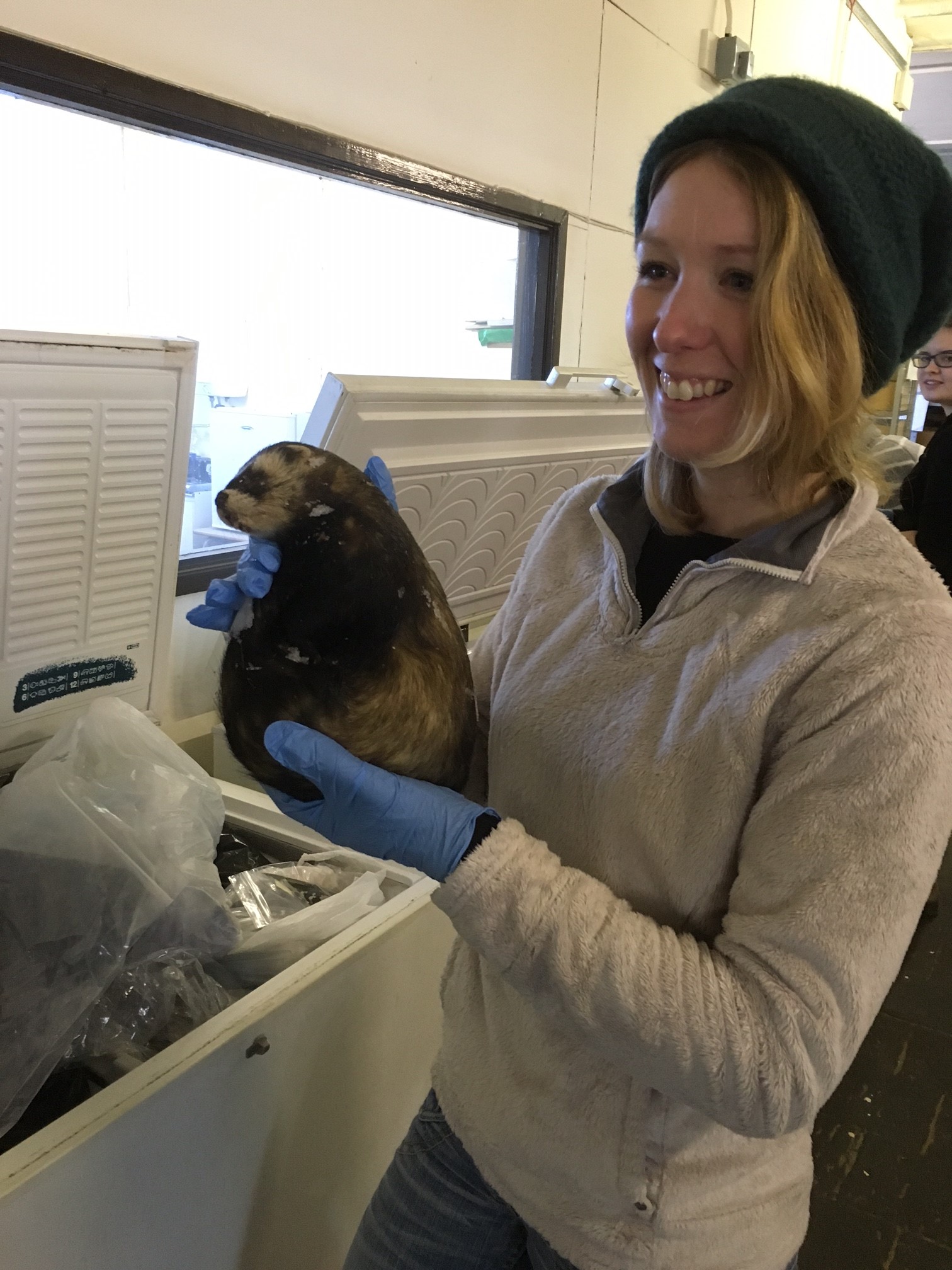 Volunteer, Jessica Mitchell proudly wielding a polecat from the freezer faunal assemblage.