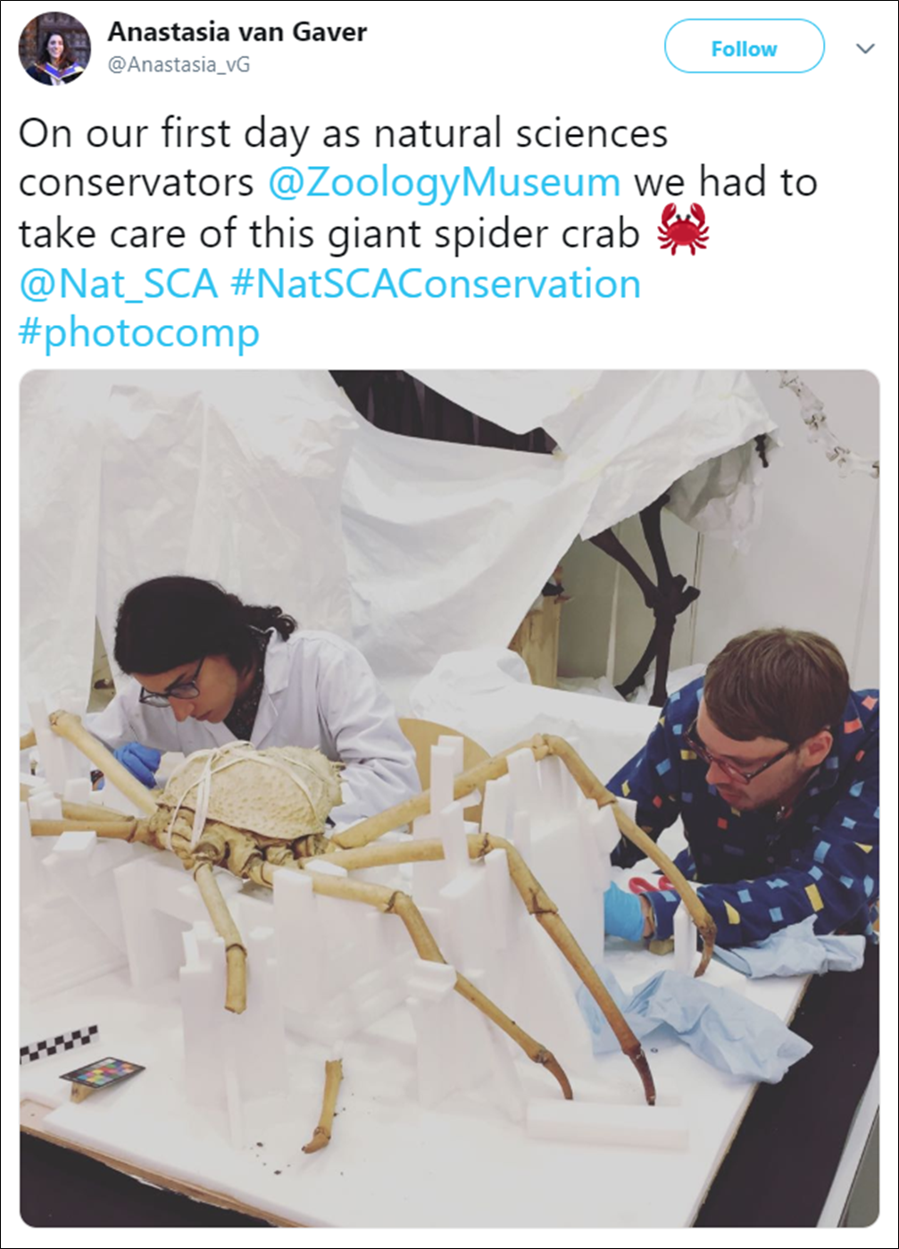 The winner is this fantastic entry from Anastasia van Gaver, which features Anastasia and her colleague Samuel Suarez Ferreira on their first day at work at the Museum of Zoology, University of Cambridge, (@ZoologyMuseum), image taken by Natalie Jones. Talk about being thrown in at the deep end with this monster of a giant spider crab. Both Anastasia and Sam attended the conference in October and gave talks on specific conservation experiences during their contracts at the Museum of Zoology. To be able to spotlight emerging professionals working with natural history collections was one of the main achievements of the conference and competition.