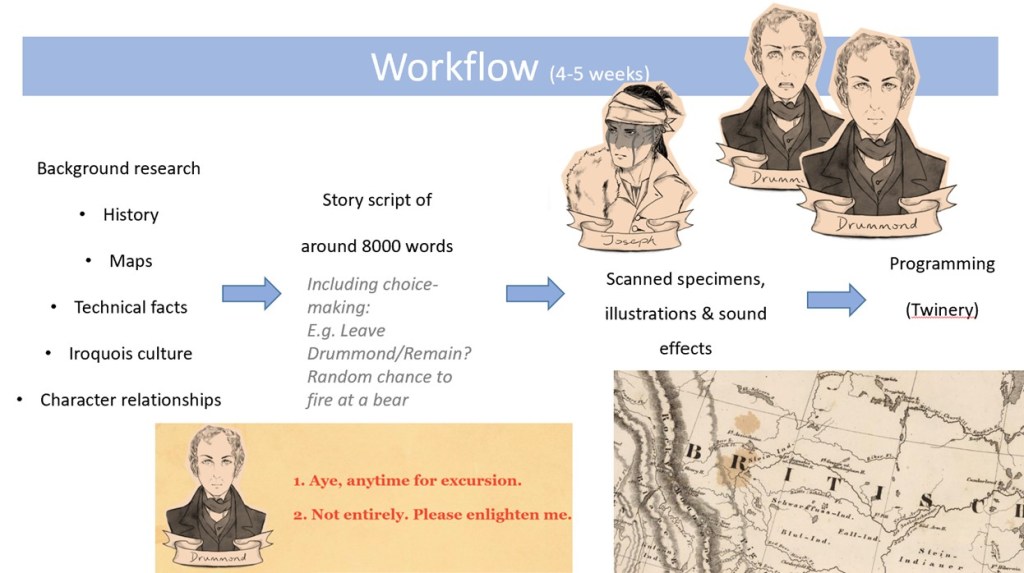 Above is a real event in Drummond’s Sketch of a Journey to the Rocky Mountains and to the Columbia River in North America, which records his excursions during Franklin’s second land expedition. It has been adapted into an interactive digital narrative, Snow, Bonfires and Mosses, in which the reader engages with a combination of novel, visualisations, sound effects and choice-making. Choice-making allows the reader to experience different narratives and explore possibilities amid ambiguities in history.