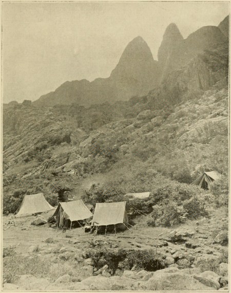Photograph of the camp at Adho Dimellus (H. O. Forbes from The Natural History of Sokotra and Abd-el-Kuri). Public Domain.