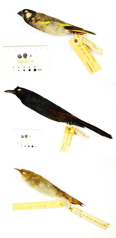 Socotra Grosbeak – Rhynchostruthus socotranus Sclater and Hartlaub, 1881 [accession number: 31.12.1900.164a] (top); Socotra Starling – Onychognathus fratus (Sclater and Hartlaub, 1881) [accession number: 31.12.1900.160e] (middle); and Socotra Warbler – Incana incana (Slater and Hartlaub, 1881) [accession number: 31.12.1900.175m] (bottom). © National Museums Liverpool (World Museum).