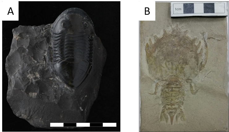 A) Isotelus gigas, and Ordovician trilobite from the Trenton Limestone. B) Eryon propinquus, a Jurassic lobster from the Solnhofen Limestone. © Horniman Museum and Gardens.