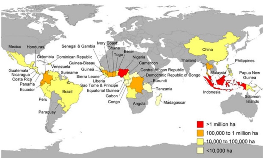 World map showing countries affected by large-scale clearance of natural habitat for producing palm oil as of 2006 (FAO 20076, via Koh and Wilcove, 20087).
